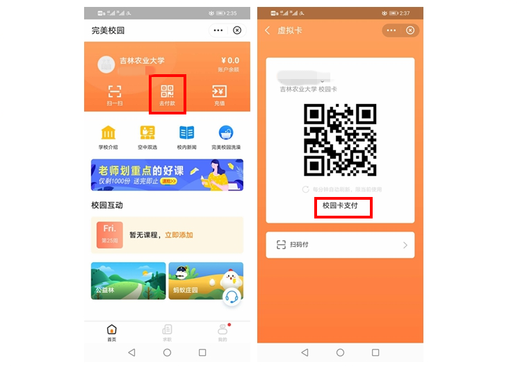 以后再进入"完美校园"小程序,直接点击【去付款】,即可生成校园卡支付二维码。