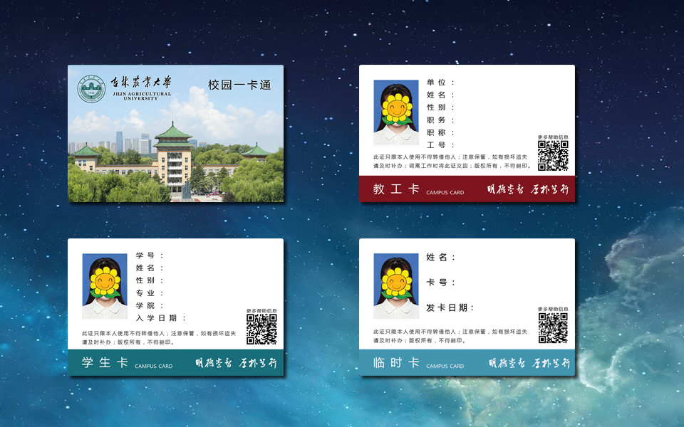 新学期,为方便师生校园生活,我校一全新卡通系统现开始上线了,分为学生卡、教工卡、临时卡等种类,新卡的样图如下: